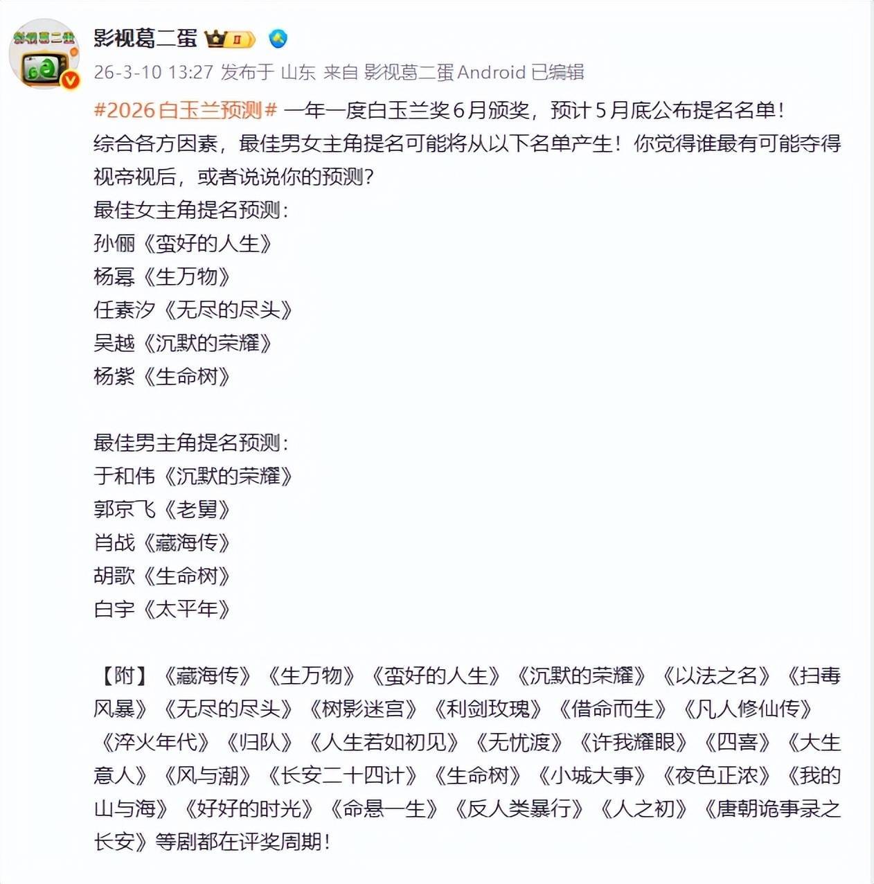 2026白玉兰奖6月就要颁奖了,5月底提名名单才会公布,可如今,心急如焚的观众纷纷按照了剧播热度,给今年的白玉兰人选预测的一番。