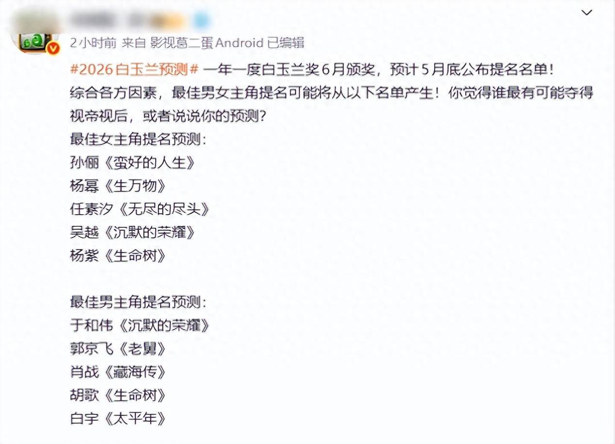 其实2026年白玉兰的争夺看着热闹,实则是国剧质量越来越高的体现,不管最后谁能拿下视帝视后,都让我们看到了国剧的魅力和希望。